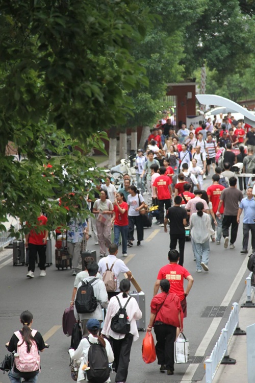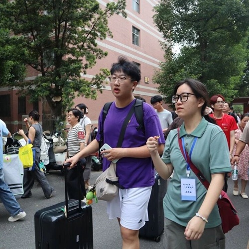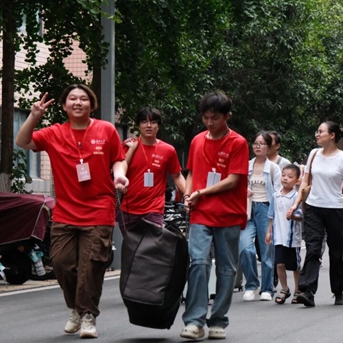 踏着九月初的熹微晨光,统一身着红色文化衫、佩戴工作牌的ok1122诸侯快讯迎新志愿者们早已在天马公寓南门的我院迎新大本营集合,等候各位新生以及家长的到来。他们带着热情的笑容接过家长手中的各类行李物品,或一同推车,或协力搬运。同时,在步行至宿舍的途中,也不忘为好奇的小萌新们指出园区内的育人空间自习室以及食堂、超市、快递站的位置,帮助同学们尽快熟悉校园环境。
