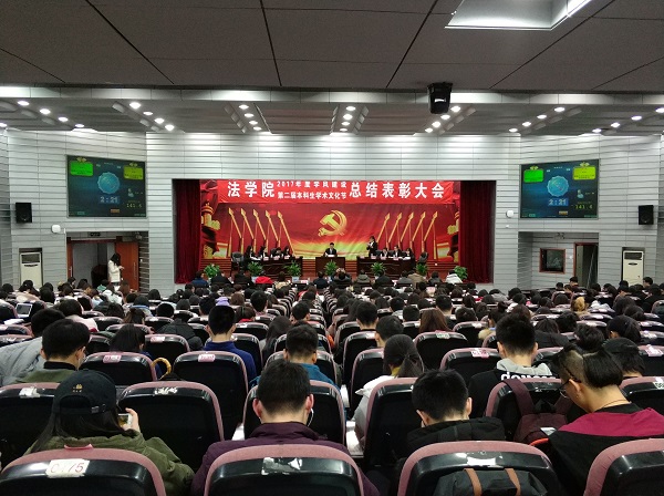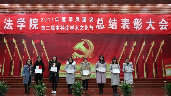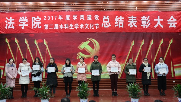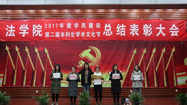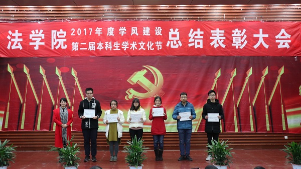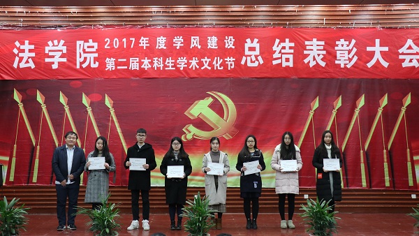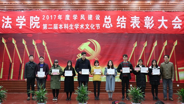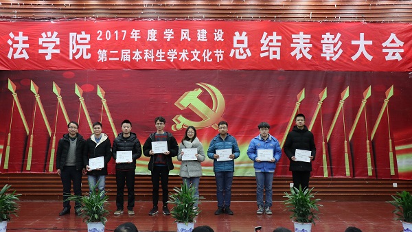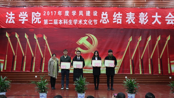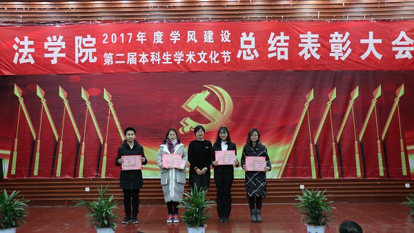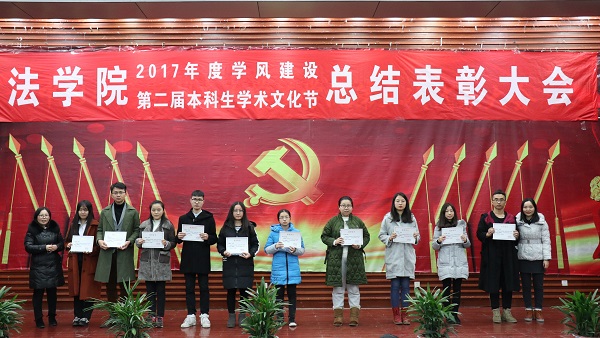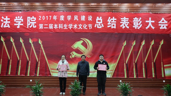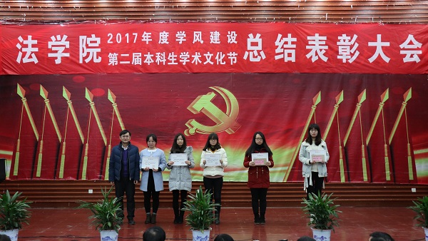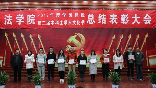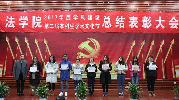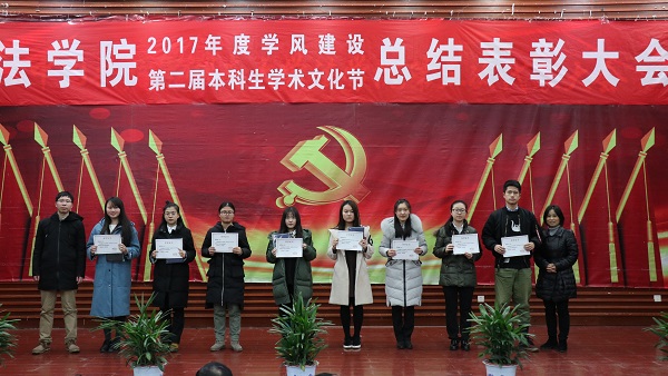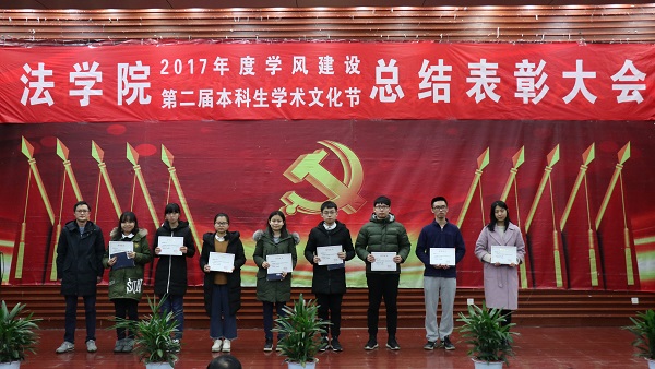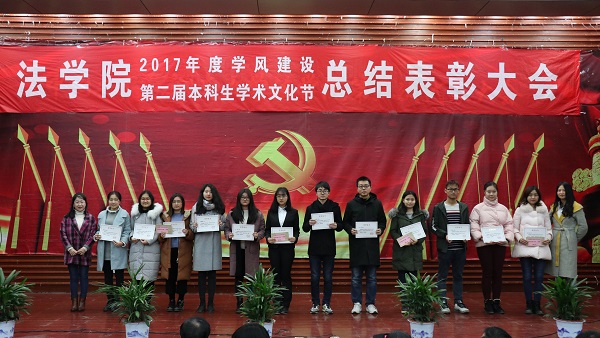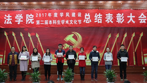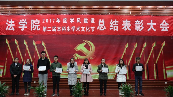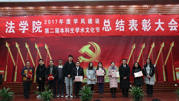 出席活动的各位老师为获得本科生学术文化节各类奖项的同学们奖颁发了荣誉证书、奖金和奖品。会上还表彰了“不忘初心,牢记使命”主题团日活动获奖班级和学院第二届学风建设评比先进班级,法学1502班、行管1501班、法学1603班、法学1604班四个班级荣获2017年度“学风建设先进班级”,行管1501班、法学1603班分别上台作了典型发言,介绍了班级在推动班级学风建设方面取得的突出成果和举措。晚9时20分许,总结表彰大会圆满结束。