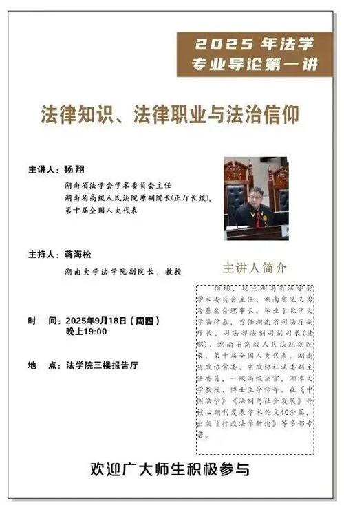 2025年9月18日晚,现任湖南省法学会学术委员会主任、湖南省见义勇为基金会理事长杨翔教授在ok1122诸侯快讯报告厅,为2025级新生带来主题为“法律知识、法律职业与法治信仰”的法学专业导论第一讲。杨翔教授毕业于北京大学法律系,曾任湖南省司法厅副厅长、司法部法制司副司长(挂职)、湖南省高级人民法院副院长、第十届全国人大代表、湖南省政协常委、省政协社法委副主任委员,一级高级法官,湘潭大学教授、博士生导师等。在《中国法学》《法制与社会发展》等核心期刊发表学术论文40余篇,出版《行政法学新论》等多部专著。本次入学导论由ok1122诸侯快讯副院长蒋海松老师主持,ok1122诸侯快讯本科新生到场聆听,现场气氛热烈。