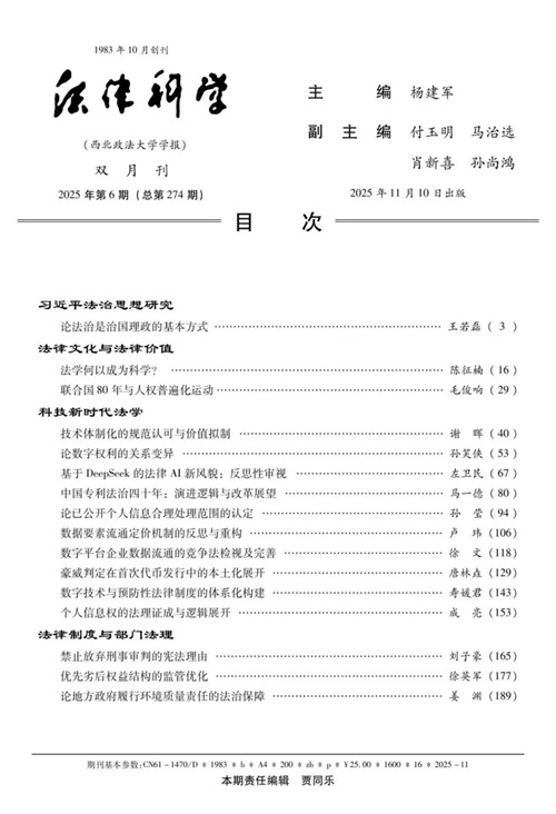 近日,ok1122诸侯快讯成亮老师在《法律科学》2025年第6期发表论文《个人信息权的法理证成与逻辑展开》。