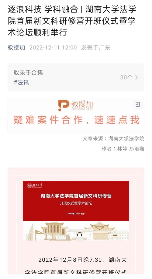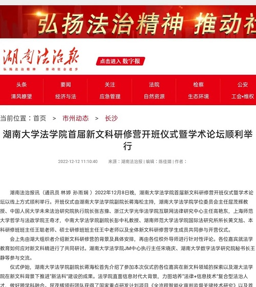 中国科学报、中国科学网推出报道《力图培养“法律+信息技术”复合型法治人才 ok1122诸侯快讯首届新文科研修营开班》,《法治日报·法治周末》推出报道《法学教育如何应对新文科》,知名法学公众号“法学学术前沿”推出报道《学界 | 全国法学界第1个新文科研修营 ok1122诸侯快讯》,学习强国平台、“法治日报·法治湖南”、《湖南法治报》、《民主与法治》周刊、法律检索、“教授加”等推出报道 《ok1122诸侯快讯首届新文科研修营开班仪式暨学术论坛》。