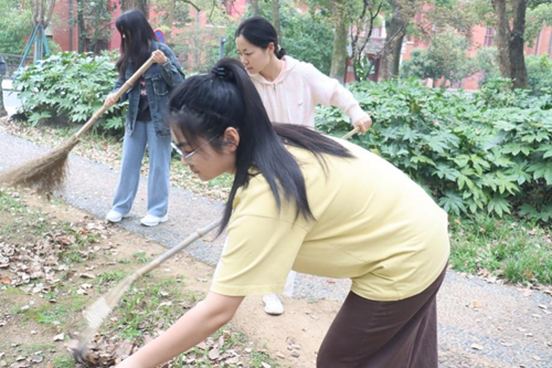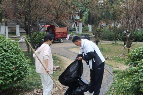上午八点三十分,志愿者们于大礼堂门口准时集合。在负责人的分工安排及环卫工叔叔的悉心指导下,同学们分组协作,重点清理了大礼堂后广场及两侧花坛中积存的落叶和垃圾。初春时节,风干堆积的落叶不仅影响美观,还存在一定的安全隐患。志愿者们手持扫帚、垃圾夹等工具,细致清扫每一处角落,并将落叶集中装袋清运。尽管劳动强度较大,但同学们热情高涨,互相配合,现场井然有序。
