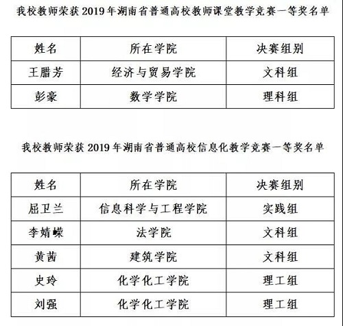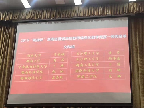 10月26日至27日,2019年湖南省普通高校教师教学比赛决赛举行。决赛分为课堂教学竞赛和信息化教学竞赛两个类别,我校共斩获一等奖7项。其中,在10月27日举行的2019年湖南省普通高校教师信息化教学竞赛现场决赛中,我院李婧嵘老师以小组第一名的成绩获得文科组一等奖!