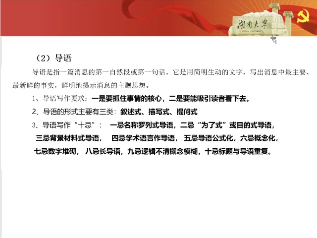接下来,马启明老师以新闻消息为例,从标题、导语、新闻主体、新闻背景及结语等方面详细讲解写作的技巧与方法。