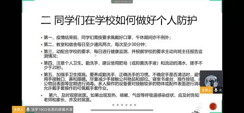 最后金老师对本次活动进行总结,鼓励同学们积极提问发言,相信法学1904班团支部同学对疫情的不安和焦虑将有所缓解,并对本学期和未来的学习之路有更开阔更明朗的视野。